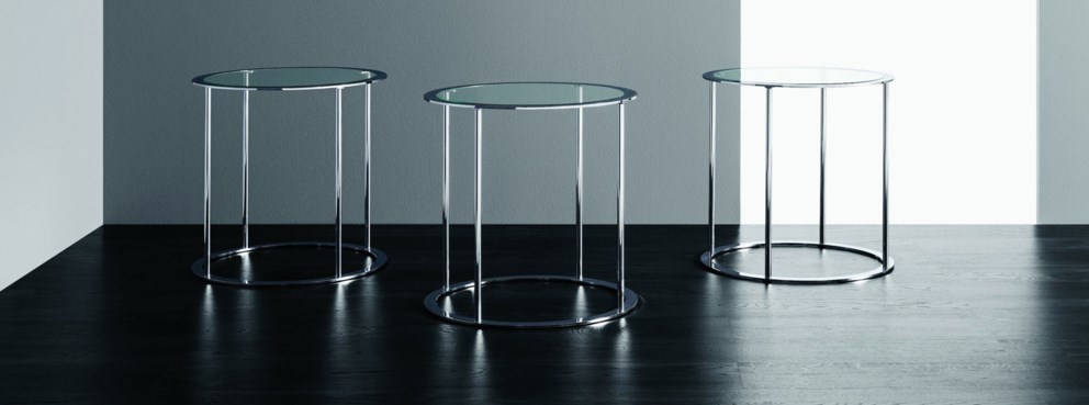 유리 상판이 있는 크롬 소재의 클래식한 원형 테이블.