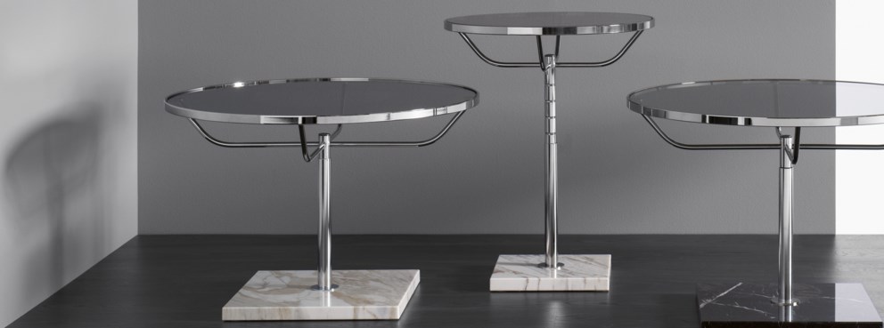 크롬 소재의 클래식한 원형 테이블. 수동 높이 조절 장치와 대리석 베이스.