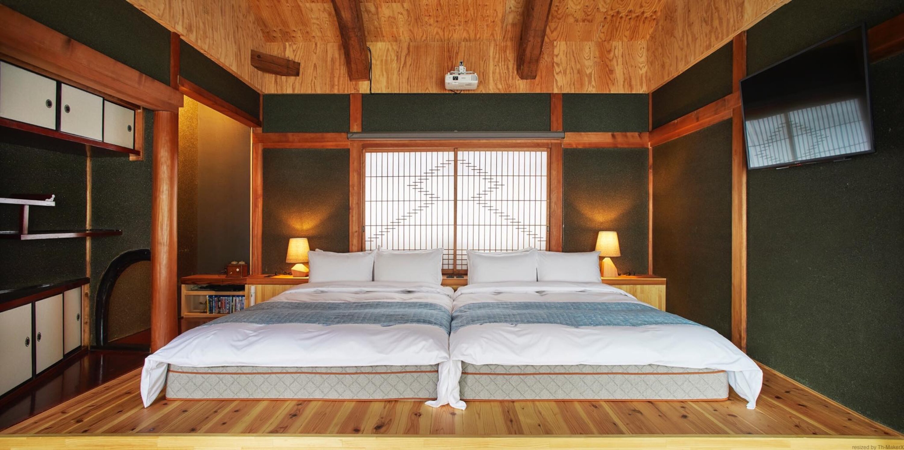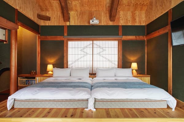 여기에서는 하루 한 그룹만 이용할 수 있는 전통 주택에서 조금은 럭셔리하게 즐길 수 있습니다. 1957년 만들어져 개조된 전통주택의 현대적이고 편안한 공간에서 편백나무 욕조와 무료 Wi-Fi, 작은 부엌, 영화를 볼 수 있는 프로젝터, 오리지널 앰프와 스피커, 편의용품 일체, 세련된 유카타가 제공되어 내 집처럼 편안함과 작은 럭셔리를 즐길 수 있습니다. 1층은 현지 재료로 만든 가정식 조식을 즐길 수 있는 카페입니다.